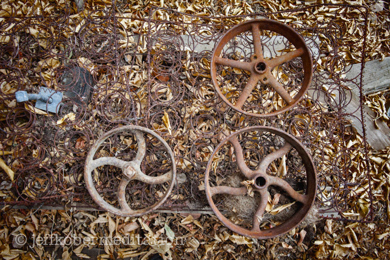 Wheels, abandoned blacksmith shop, Young’s Point, Montana